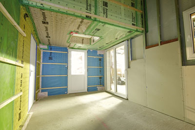 Lors des formations techniques, l’objectif proposé aux participants est de trouver des solutions pour rendre étanche à l’air cette aile droite et d’effectuer un test « blower door » en fin de journée (cf. encadré). Cette maison école sert également de showroom et met en avant les différentes solutions de sarking (isolation de la toiture par l’extérieur) et d’isolation thermique par l’extérieur ou l’intérieur.