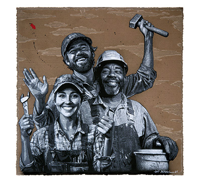 Cette entreprise a débuté en 2014 avec VanLuc et sa Vache de Préférence (pour Legallais évidemment NDLR) pour se renouveler chaque année jusqu’à cette édition 2026 qui voit un des maîtres du stencil graffiti Jef Aérosol mettre son talent au service du distributeur normand. Imaginant des images réplicables grâce à de la peinture en aérosol projetée sur des pochoirs, l’artiste a cette fois-ci délaissé l’espace public pour créer une œuvre en noir en blanc sur carton rendant hommage à tous les professionnels du second œuvre. Baptisée « ARTisanat … », cette œuvre trace le portrait de trois artisans avec leurs outils, « Ceux qui, par leurs gestes maîtrisés et leurs savoir-faire techniques, façonnent notre quotidien. » Ce pochoir illustrera la couverture du catalogue 2026 de Legallais et sera également portée sur les voiles du bateau parrainé par l’entreprise qui prendra le départ de la Route du Rhum en novembre prochain.