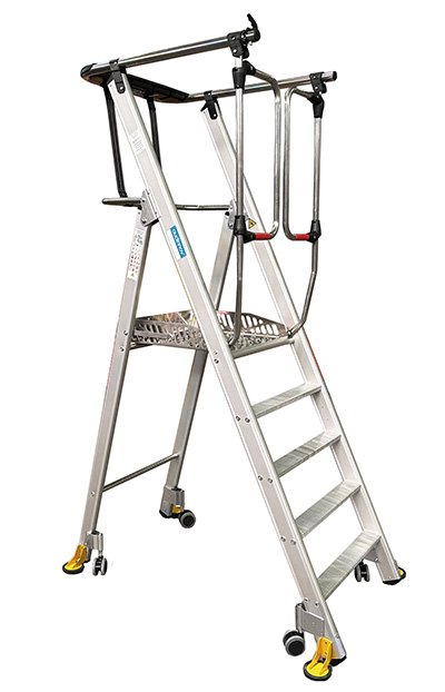 La plate-forme individuelle roulante sécurisée Ultralight LXM du fabricant Audinnov possède un poste de travail de 420 x 480 mm tout en bénéficiant d’une largeur déployée de seulement 78 cm permettant le passage des portes et des ascenseurs. Elle est pourvue de quatre roues directionnelles s’effaçant à la montée de l’utilisateur, de montants avec patins antidérapants pour la stabilisation au sol, de marches striées, d’un plancher en aluminium forte résistance, d’un garde-corps repliable d’un seul geste et de portillons pivotants à retour automatique. Elle bénéficie en outre d’une cinématique d’ouverture et de fermeture aussi simple que celle d’un escabeau.
