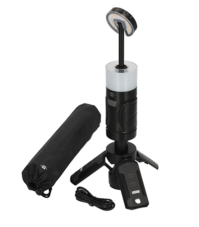 Utilisable comme torche ou comme lanterne, le tripode compact UL 400 AT est télescopique jusqu’à une hauteur de 1,03 m et intègre une tête led inclinable à 180° qui permet de faire varier la luminosité. Ses leds peuvent être tournés vers l’extérieur et projeter leur intensité maximale de 400 lm ou être tournés vers l’intérieur pour émettre une lumière diffuse sur 360° avec un éblouissement réduit. La lumière peut être ajustée en continu de 10 à 100% via un variateur ou être réglée par paliers sur 50% et 100% avec en plus les modes lumière rouge et SOS. La température de couleur est également modulable en continu et par paliers de 2 200 à 6 000 K. Ce tripode, dont la batterie amovible 3,6 V 3000 mAh est rechargeable par usb-C, peut aussi servir de powerbank.