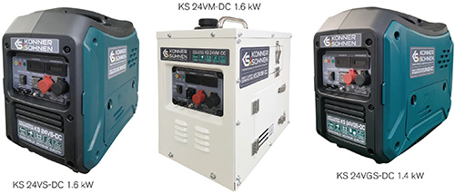 Trois groupes sont proposés, deux avec une puissance nominale de 1,6 kW (courant 60 A) et le dernier en 1,4 KW (50 A), les deux premiers fonctionnant à l’essence et le troisième étant bi-carburant fonctionnant à l’essence ou au gaz. Ces trois appareils sont logés dans des boîtiers insonorisés robustes d’une grande stabilité.