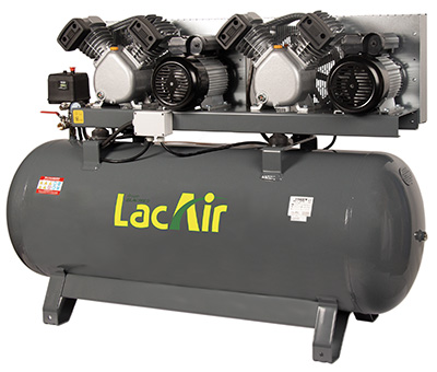 Le compresseur Tandem 42/270 M LacAir de Lacme est un équipement avec une cuve de 270 litres qui permet d’offrir un débit d’air important de 29 m3/h, pour 42 m3/h aspiré, avec un branchement à une simple prise monophasée, sans avoir donc se connecter à du triphasé. Cette performance bien supérieure au standard – Lacme propose par ailleurs du 16,6 m3/h restitué en monophasé – est atteinte en couplant deux moteurs qui démarrent avec un relais temporisé pour limiter la crête d’intensité initiale ; une fois que le premier couple moteur-groupe est stabilisé, le deuxième est enclenché pour apporter toute la puissance attendue. Les moteurs, des bicylindres en V pour optimiser le refroidissement, tournent à une faible vitesse de 900 tr/min.