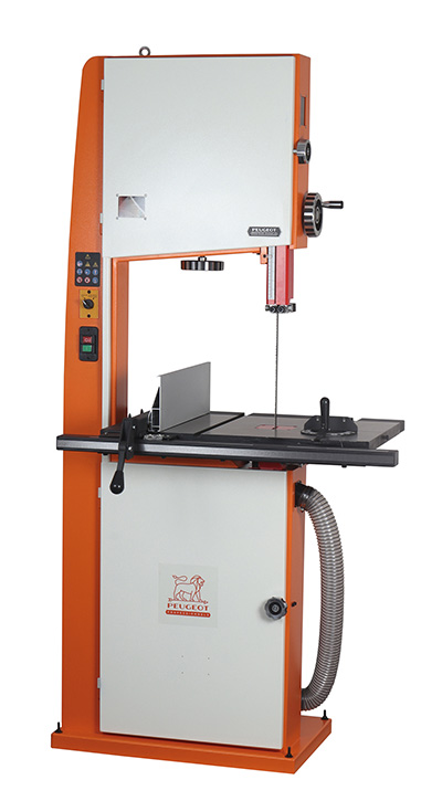 Pour les scies à ruban (bois), là aussi proposées en trois modèles de différentes capacités, c'est la référence supérieure PSR480 d’une hauteur de 2 040 mm qui intègre toute la technologie déployée par la marque. Cette machine d’une puissance de 2 800 W possède une table en fonte rectifiée de 560 x 450 mm orientable de -5 à +45° par engrenage et un ruban de 3 914 mm x 6 à 25,4 mm tournant à la vitesse de 920 m/min (volants de ∅ 480 mm). Ses capacités de coupe maximales sont de 470 mm de largeur et 410 mm de hauteur. Elle possède une fenêtre de visualisation pour lire la tension de la courroie et, associé, un levier en partie arrière permettant de régler cette tension de façon rapide. Son carter haut et bas s’ouvre d’un seul tenant, tout démarrage de la machine étant impossible lors de cette ouverture. Toutes les commandes sont en façade. Des buses d’aspiration de 100 mm sont prévues avec un captage en deux points. Les deux autres scies ont des rubans de 3 597 et 2 240 mm de longueur, pour des profondeurs de coupe de 420 et 305 mm (360 et 165 mm en hauteur de coupe).