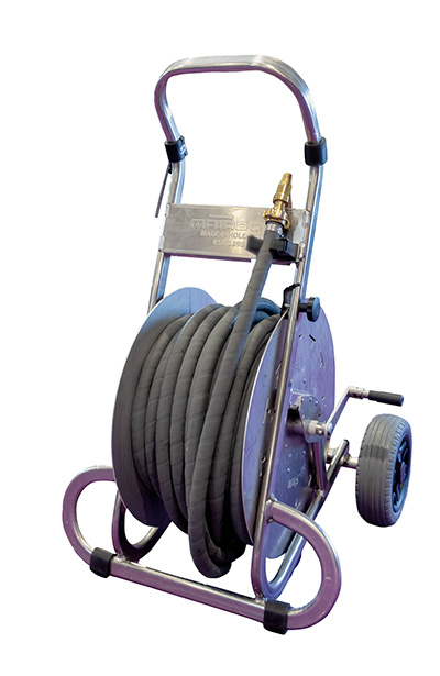 Le résultat est un dévidoir fabriqué en aluminium aéronautique renforcé de titane et de magnésium adapté à l’utilisation de tuyaux de 40 m de longueur au diamètre 19 mm en standard (60 m en 16 mm et 70 m en 13 mm). Il bénéficie d’un construction robuste effectuée dans l’usine néerlandaise de Matador avec des caractéristiques élevées, comme un frein de tambour réglable en continu, des butées en caoutchouc pour protéger le châssis du sol, un support pour un pistolet d’arrosage, des roues à pneu increvable tout terrain à double roulement à billes étanche. Il comporte également un raccord de tuyau pivotant à 360° et coudé avec un angle ouvert pour ne pas freiner le flux d’eau et donc éviter toute perte de pression (pression maximale de service de 10 bar). A noter que ce dévidoir peut être utilisé debout ou couché et se transporte facilement grâce à un poids équilibré.