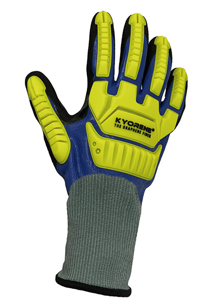 Monté sur un support en graphène Kyorene Pro Gris de jauge 18, le gant K00-845IP de Kyorene totalement enduit pour une étanchéité totale comporte sur la paume un revêtement additionnel en micromousse de nitrile HCT® noir et sur le dos et les doigts des éléments de protection contre les chocs, configuration qui lui permet d’être normé 4X43DP. Il comporte aussi un renfort entre le pouce et l’index et peut-être utilisé avec un écran. A noter que l’utilisation du graphène inhibe la multiplication des bactéries, améliore la régulation thermique, la résistance aux UV et la neutralisation des odeurs.