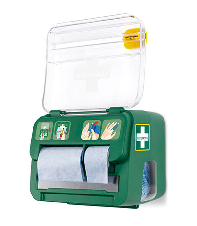 Cederroth a inclus dans sa gamme un distributeur 2-en-1 de pansements autoadhésifs qui met à disposition deux rouleaux de dimensions différentes pour une prise en charge rapide et facile des blessures mineures (6 cm x 4,5 m et 3 cm x 4,5 m) – un distributeur existait déjà pour la largeur la plus grande. Celui-ci possède un couteau intégré, un couvercle de protection transparent, une fenêtre latérale pour vérifier la quantité de produits restante et est verrouillable avec une clé de rechargement spéciale. Ce boîtier compact (14 x 12 x 14 cm) se fixe facilement au mur et comporte en façade les instructions (sous forme graphique) pour sa bonne utilisation et l’emploi des pansements autoadhésifs. A noter que ce produit, fabriqué avec plus de 92% de plastique recyclé, a obtenu un Red Dot Award 2025. La dotation initiale est en pansements bleus mais les recharges peuvent aussi être faites en pansements beiges ou noirs.