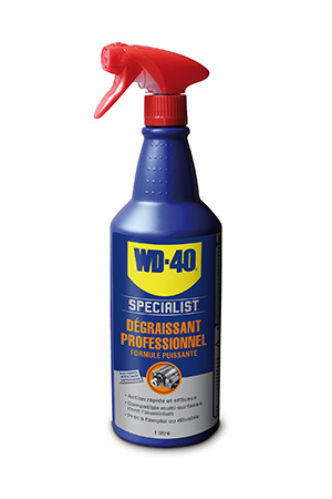 Le Dégraissant Professionnel WD-40 Specialist, formulé à base d’eau et d’agents actifs haute performance, nettoie en profondeur et sans les altérer tous les types de surfaces, y compris l’aluminium. Polyvalent, il peut être utilisé pur pour les salissures très incrustées (moteurs, taches d’huile, barbecues, tondeuses…) ou être dilué à différentes concentrations selon les supports, 1:5 pour les pare-chocs, les carrelages, les joints, 1:20 pour la carrosserie, le plastique, le caoutchouc, les surfaces peintes et 1:100 pour les fenêtres. Ce produit est certifié NSF A8, adapté aux environnements régis par des normes de sécurité alimentaire (rinçage à l’eau potable requis). Conditionné sous forme de pulvérisateur en flacon d’un litre.