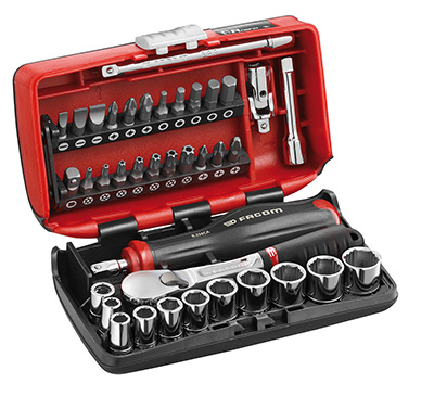 Autre coffret, le kit de 38 outils Nano 1 GRPPB, avec un cliquet 1/4’’ étanche OVG grip, 20 embouts PZ, PH, Fente, 6 pans et Torx plus 10 douilles, permet un serrage/desserrage sur de la boulonnerie arrondie, grippée ou oxydée. La géométrie OGV des douilles permet de repousser le point de ripage et d’appliquer un plus grand couple.