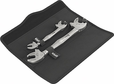 Les clés double fourche auto-ajustables Joker 6006 de Wera comportent à chacune de leurs extrémités une fourche dont les mors parallèles s’adaptent automatiquement à la taille de la pièce à saisir et exercent une pression garantissant la tenue de la prise. Ces têtes, dont l’angle de reprise est de seulement de 30°, intègrent la fonction cliquet pour permettre un vissage rapide sans désengagement de la clé. Elles couvrent toutes les dimensions métriques et impériales avec deux références, à savoir la XS/S qui va globalement de 7 à 10 mm et de 10 à 13 mm et la M/L qui va de 13 à 16 mm et de 16 à 19 mm. Cette polyvalence permet à la marque allemande d’indiquer que ce jeu de deux clés livrées dans une trousse dédiée remplace avantageusement douze clés métriques.