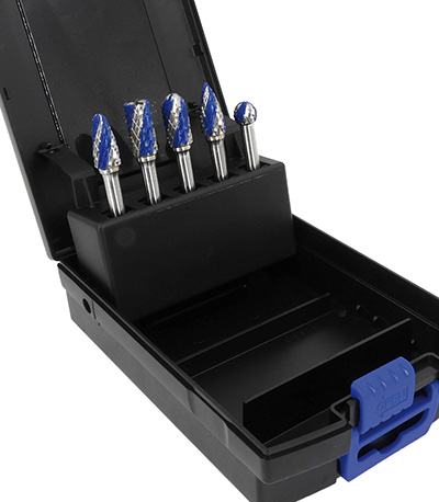 Alpha Coupe commercialise dans sa gamme Industrie une offre de cinq fraises limes rotatives carbure à denture croisée variable pour une utilisation sur la plupart des matériaux, et notamment la fonte, l’acier dur, l’acier de construction et l’inox. Reconnaissables à leur denture variable teintée en bleu, ces outils coupants procurent un gain important en termes d’usinage par rapport à une fraise lime avec denture croisée classique. L’effort de coupe est réduit de 35% tandis que la vitesse d’exécution est augmentée de 50% selon les données de la marque. Cette ligne comporte deux fraises limes cylindriques (bout arrondi, coupe en bout) et deux en ogive (bout arrondi, bout pointu) proposées dans les diamètres 6 à 12 mm, ainsi qu’une sphérique en diamètre 10 mm. Ces fraises limes sont vendues en coffret réunissant les cinq formes et à l’unité, hormis le modèle sphérique.
