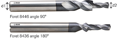 Autre article, le foret carbure étagé 8436 avec angle de fraisage de 180° permet de percer et de fraiser en une seule opération pour noyer des têtes de vis rondes dans des aciers de 35 à 45 HRC. Il est proposé dans les dimensions M3 à M12 avec des diamètres de coupe allant de 6 (d1) et 3,4 mm (d2) à 20 et 14 mm. Sa tolérance est de h8 sur le diamètre étroit dans la profondeur du trou et de h6 en partie supérieure. Ce foret est décliné dans la référence 8446 avec un angle de fraisage de 90° pour les vis à tête fraisée, toujours de M3 à M12 dans les diamètres 6 (d1) et 2,5 mm (d2) à 14 et 10,2 mm. Ces deux forets sont disponibles avec ou sans trou de lubrification interne et sont à utiliser sur des machines CNC.
