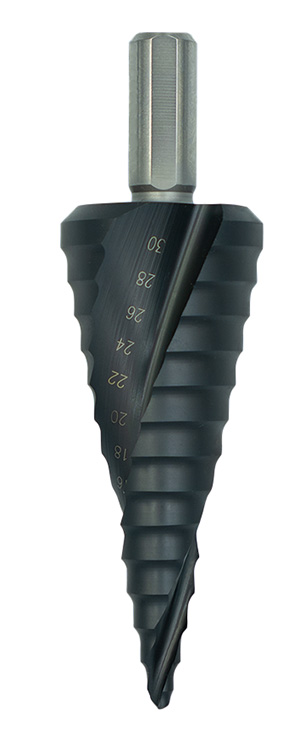 En termes de dimension, ce foret étagé est décliné en trois séries 4-12 mm et 4-20 mm (neuf dimensions) et 4-30 mm (treize dimensions), plus deux autres pour le filetage des tubes électriques (M10-32 et M10-40) et pour l’assemblage des garde-corps en 6-18 mm (sept dimensions). Ces outils sont disponibles en queues cylindriques 3 méplats et attachement hexagonal 1/4’’, hormis la ligne garde-corps non prévue en version six pans.