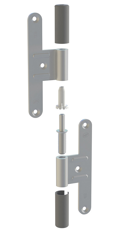 La paumelle universelle 130 x 86 épaisseur 3 mm Monin 6055 de Torbel Industrie est certifiée NF grade 11, soit 200 000 cycles ouverture/fermeture pour une porte de 80 kg, et peut être utilisée par tout fabricant de portes certifiées NF. Elle intègre un fourreau invisible clipsé sur l’axe mâle et indécrochable en cas de dégondage, et deux bouchons cache-paumelle qui recouvrent le nœud central et se rejoignent totalement pour ne laisser apparaître aucune partie métallique – bouchons disponibles en blanc, gris, inox et noir en standard. Le réglage à ±2,5 mm en hauteur se fait sans dégonder la porte avec une clé à double empreinte.