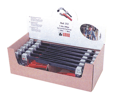 Urko a prévu pour cinq références de serre-joints des présentoirs de comptoir cartonnés prêts à l’emploi avec un fronton comportant l’explicatif du produit qui chapeaute une boîte organisée pour présenter douze outils de façon ordonnée. Les cinq articles de serrage concernés par cette proposition sont les modèles 21 (poignée à vis), 21-H (poignée en T) et 4021-HA (poignée alu articulée), M210 Quick (rapide) et 212 (presse à levier).