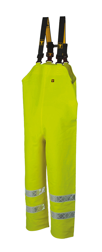 Normée EN343 41X contre les intempéries, la cotte Hitflash de Guy Cotten est proposée en jaune et en orange fluo avec des bandes Reflexite® GP340 (700 candelas) qui la positionne au niveau 1 en classe de haute-visibilité. Cette salopette haute réversible en tissu enduit souple et étanche Vistex – enduction PVC sur support polyester – possède des coutures soudées haute fréquence qui préservent sa totale imperméabilité et des bretelles élastiques avec Fixlock avant et arrière. Elle peut être portée avec d’autres EPI haute-visibilité.