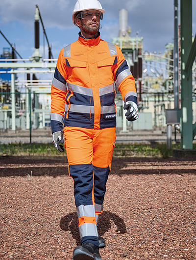 Ce pantalon bicolore, en tissu Sio-Safe™ Extra Light 260 g/m2 57% aramide 42% polyester 1% AST, est la version Multinorm UP de la référence Bakki. Héritant de son look moderne, il associe le tissu principal en orange fluo à des zones en bleu marine et bénéficie d’une construction soignée (nombreuses poches, taille élastiquée, bande taille avec passants de ceinture…). Il intègre trois longueurs d’entrejambe, des genoux préformés et des emplacements à deux niveaux pour insérer les genouillères. Il est prescrit en combinaison avec la veste de travail multirisque Pictor.