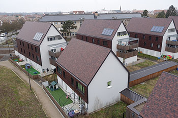 La Ville de Strasbourg a engagé un programme de construction de 55 logements conçu comme une extension de la cité jardin du Stockfeld, ce joyau de l’habitat social réalisé par Edouard Schimpf en 1910 et inscrit à l’inventaire supplémentaire des monuments historiques depuis 1996. Pour ces nouveaux habitats, les architectes ont utilisé l’ardoise Pommay Eternit qui par son aspect moiré et sa teinte fait le lien visuel avec la citée jardin du Stockfeld, dont les bâtiments sont reconnaissables au caractère pittoresque de leur couverture en tuiles. La composition fibres-ciment de ces ardoises classées Q4/T3 permet d’alléger le poids de la charpente et optimise le confort de pose.
